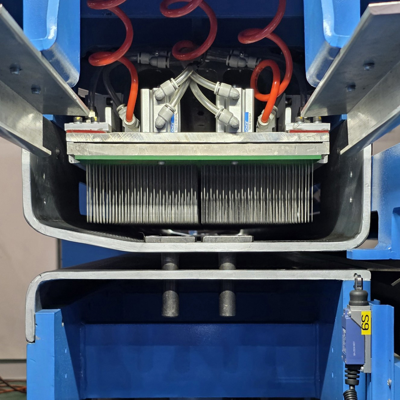 - The compressed web delivered from the web feeder undergoes primary needle punching, binding the fibers and forming a nonwoven fabric with uniform thickness.