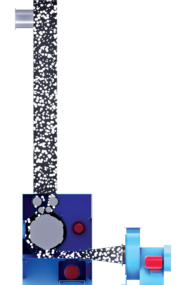 • 이송된 Fiber가 Upper Box를 통해 일정하게 아래로 압축되면서 하강하고, 2단 구성의 Feed Roller가 균일하게 Fiber를 공급한다.